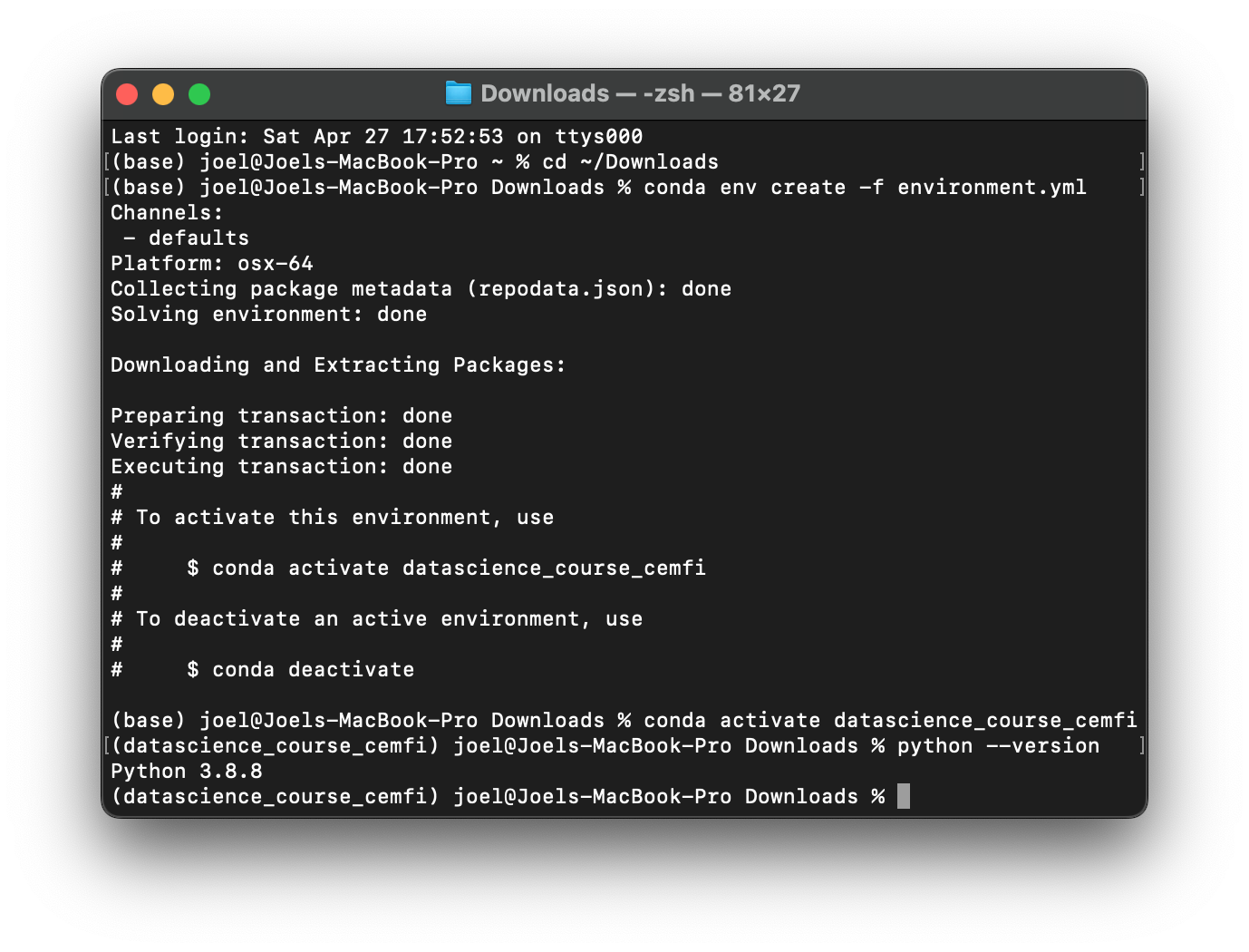 environment.ymlfile. On macOS/Linux, you can do this by running the following command in the terminal:cd ~/Downloadswhich will navigate to the