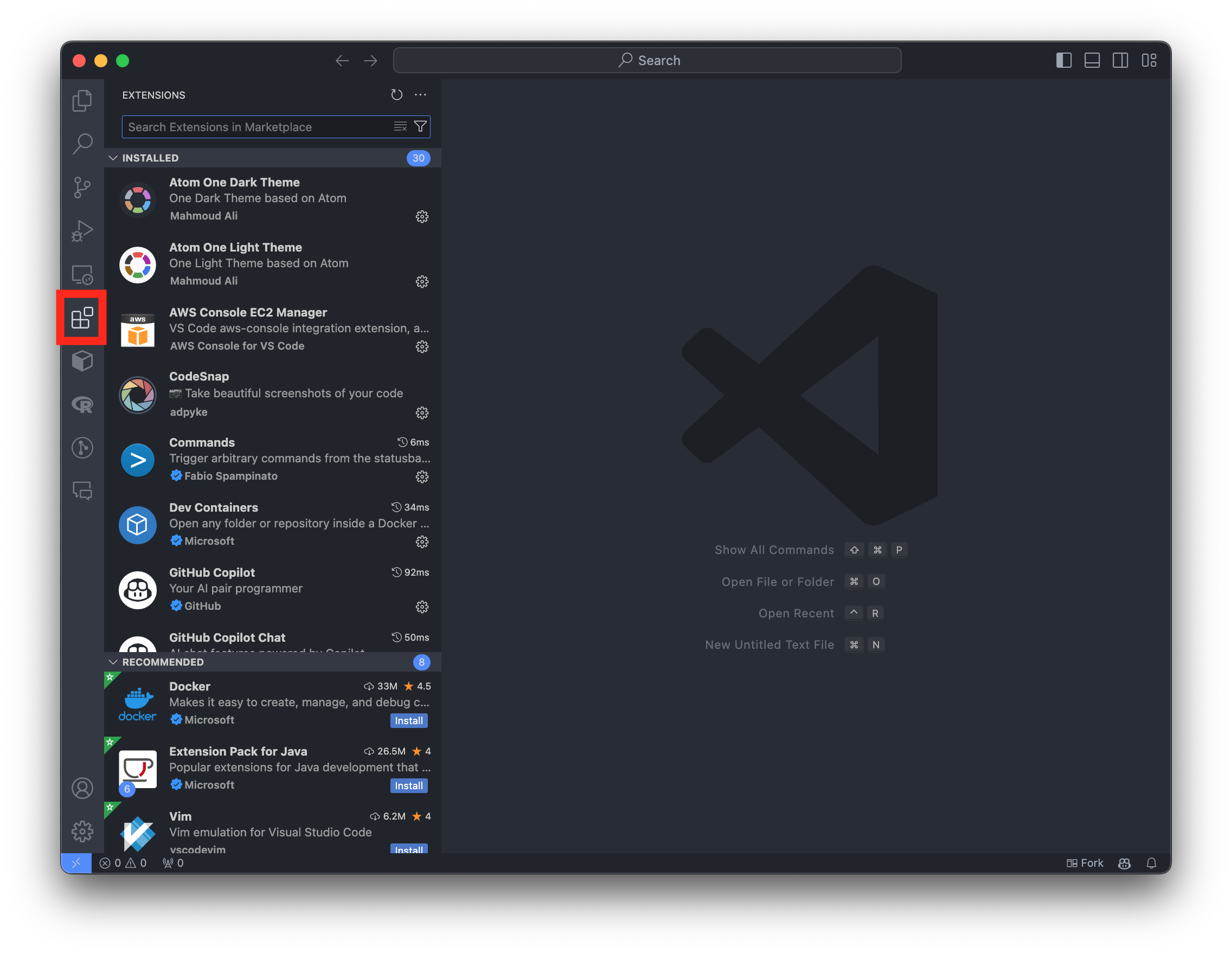 Extensionsicon on the left sidebar (or pressCmd+Shift+Xon macOS orCtrl+Shift+Xon Windows).