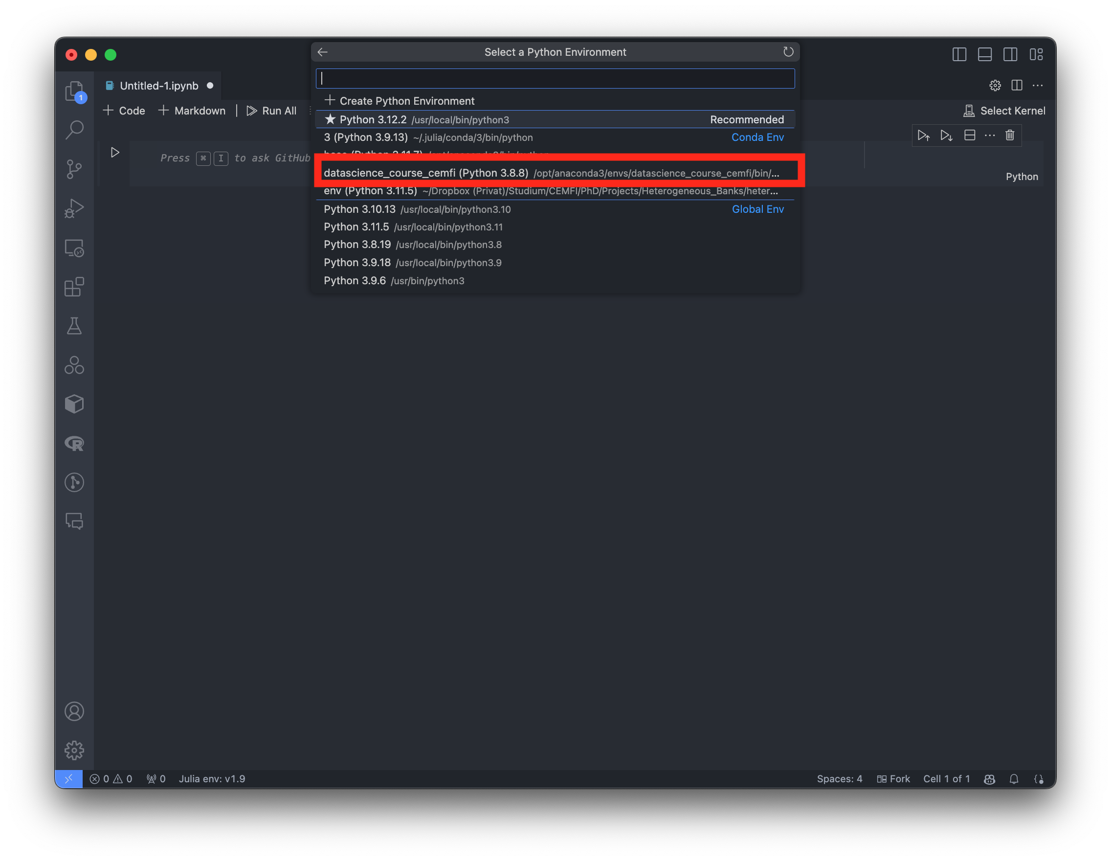 VSCode Jupyter Kernel Selection Run the first cell of the notebook by clicking on the