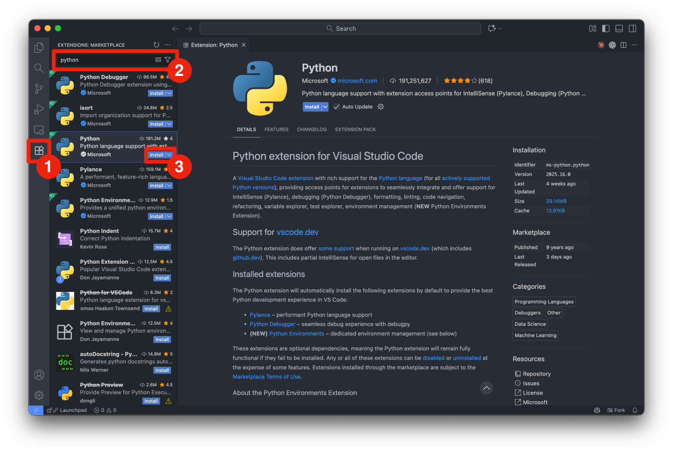 Jupyter Notebooks are interactive documents that combine live code, visualizations, and explanatory text. They’re ideal for exploratory data analysis and prototyping. They allow you to write and execute code in small chunks (cells), see immediate outputs, and document your thought process alongside the code. While Jupyter Notebooks are excellent for exploration and learning, they may not be the best choice for production code or large projects due to challenges with version control and code organization. However, they remain a popular tool in data science and AI for their interactivity and ease of use. We will execute Jupyter Notebooks within VSCode instead of the more traditional browser-based interface. The reason for this choice is to provide a unified development environment where you can seamlessly switch between writing notebooks and scripts, debugging code, and managing files. Furthermore, VSCode integrates well with recent AI-assisted coding tools, which can enhance your productivity.