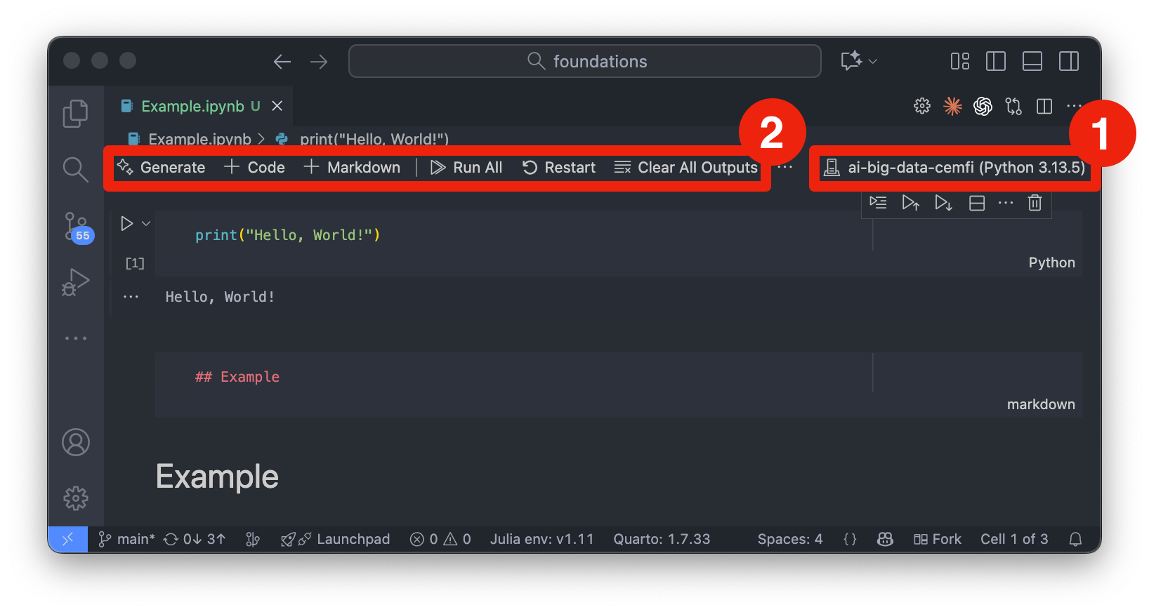 .ipynb) or create a new one from the menu (“File” -> “New File” and then select “Jupyter Notebook”).ai-big-data-cemfi as the kernel. You can change the kernel by clicking on the current kernel name (or “Select Kernel”) in the top-right corner of the notebook interface (denoted by number 1 in Figure 2.2). Then, click on “Python Environments” and select ai-big-data-cemfi from the list.If you have done this correctly, you should see ai-big-data-cemfi displayed as the selected kernel as shown in Figure 2.2.
