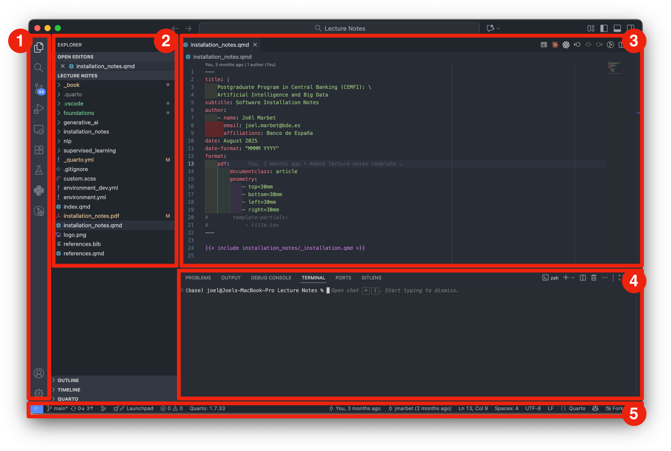 Figure 2.4 shows an example of a Python script opened in VSCode. You can run the entire script by right-clicking anywhere in the editor and selecting “Run Python File in Terminal” or by clicking the “Play” button (denoted by number 1 in Figure 2.4). The output will appear in the integrated terminal at the bottom of the VSCode window.