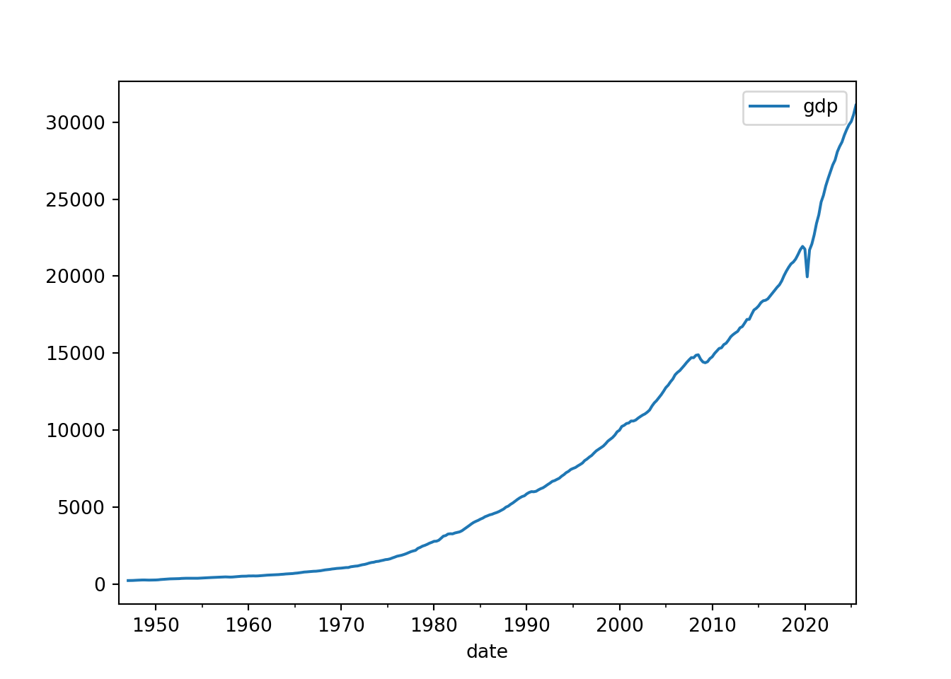 df = pf.get_series('GDP') # Note that you can provide the API key manually by adding the parameter api_key='YOUR_API_KEY' if you have not set it up as an environment variableWe can then display the retrieved data