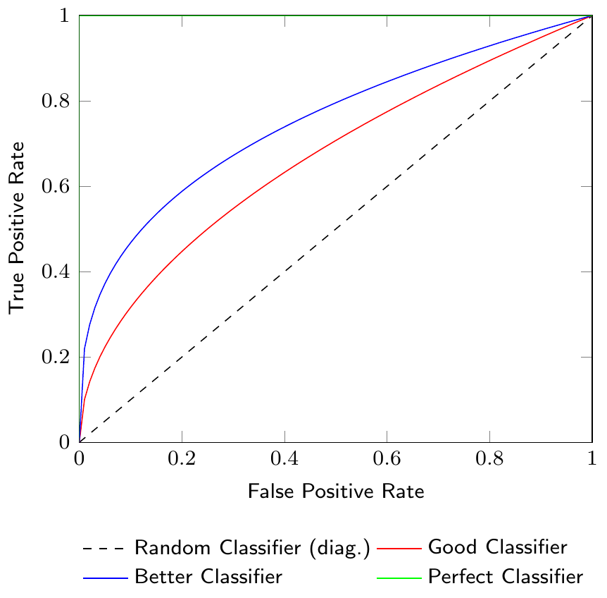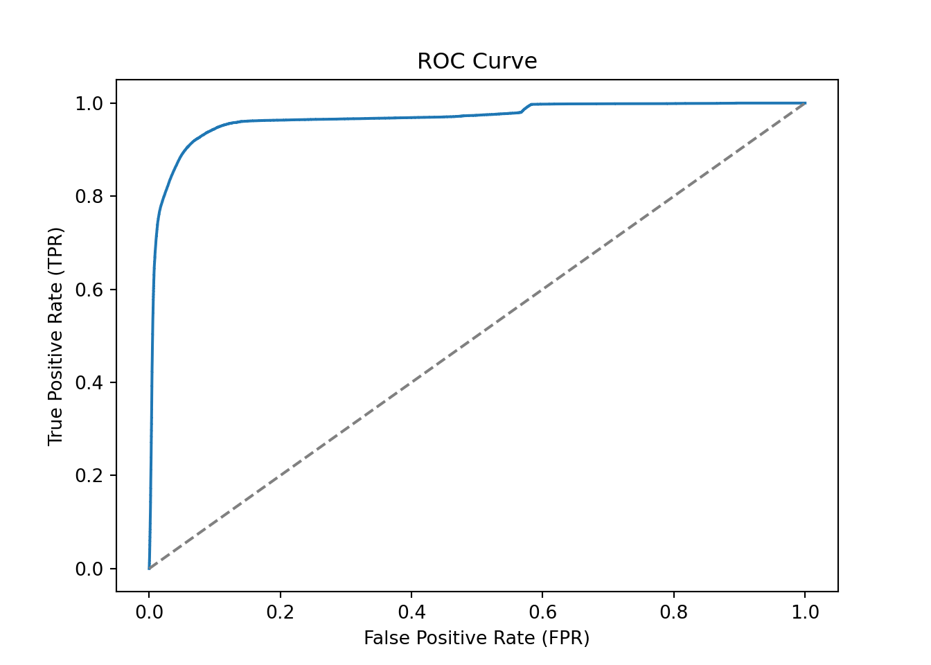 print(f"ROC AUC: {roc_auc_score(y_test, y_proba[:, 1])}")As expected, the accuracy is quite high since we do not have many fraudulent transactions. Recall that the precision (\(\text{Precision} = \frac{\text{TP}}{\text{TP}+\text{FP}}\)) is the fraction of correctly predicted fraudulent transactions among all transactions predicted to be fraudulent. The recall (\(\text{Recall} = \frac{\text{TP}}{\text{TP}+\text{FN}}\)) is the fraction of correctly predicted fraudulent transactions among the actual fraudulent transactions. The ROC AUC is the area under the curve for the receiver operating characteristic (ROC) curve.
