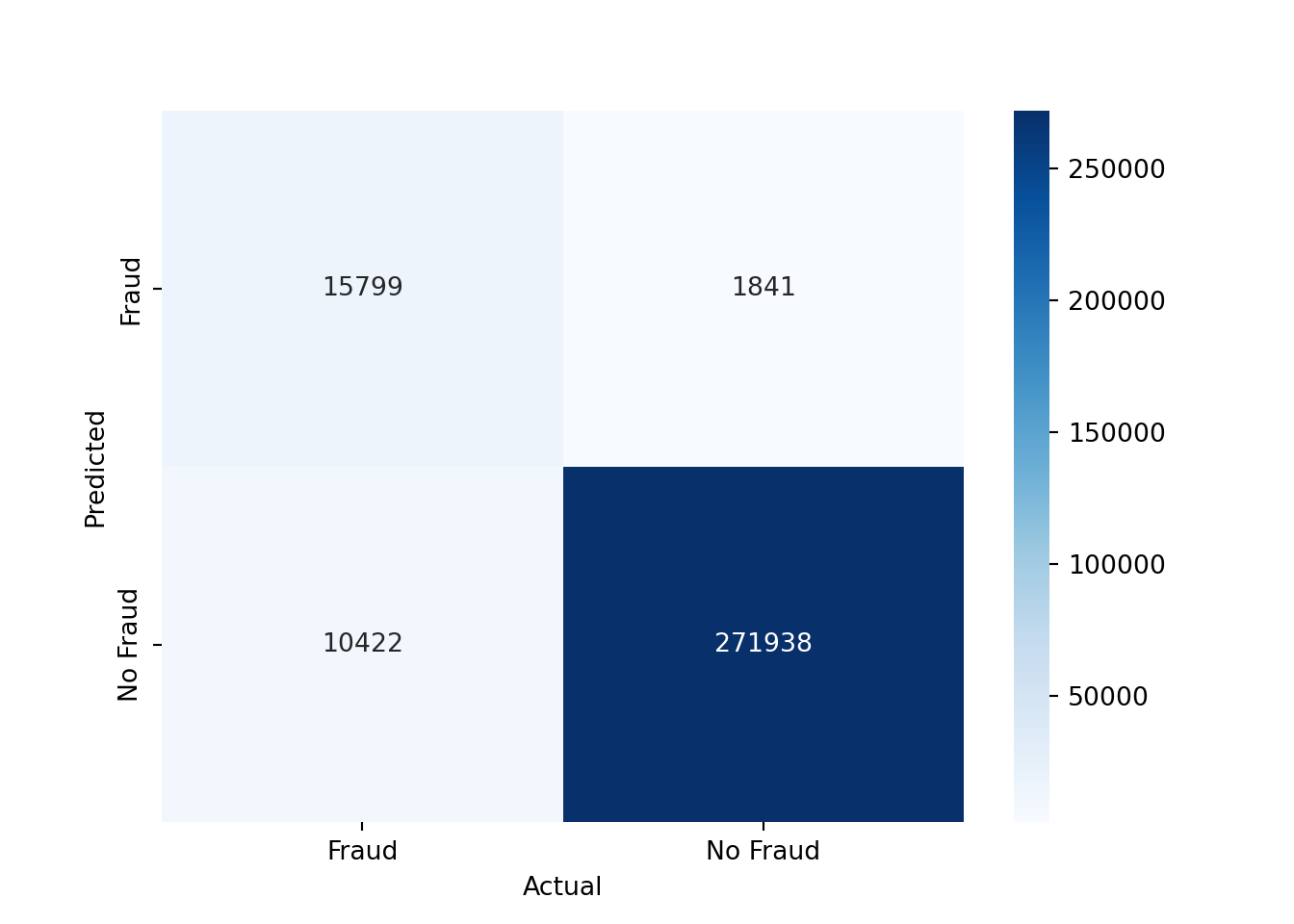 As you can see, we have mostly true negatives and true positives. However, there is still a significant number of false negatives, which means that we are missing fraudulent transactions, and a significant number of false positives, which means that we are predicting transactions as fraudulent that are not fraudulent.