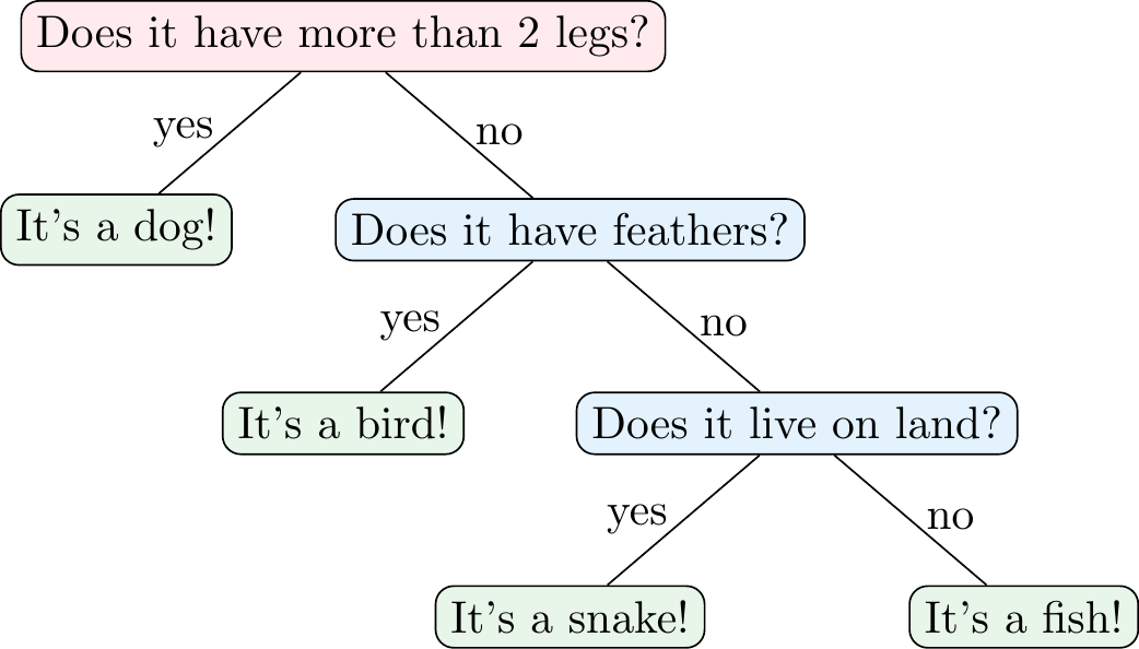 Figure 4.1 shows an example of a decision tree for a classification problem, i.e., a classification tree. In this case, the decision tree is used to classify animals into four categories: dogs, snakes, fish, and birds. The tree asks a series of questions about the features of the animal (e.g., number of legs, feathers, and habitat) and uses the answers to classify the animal. This means that the tree partitions the feature space into different regions that are associated with a particular class label.