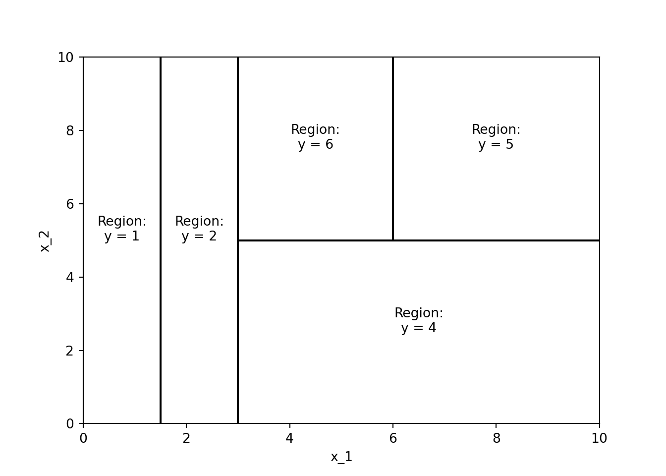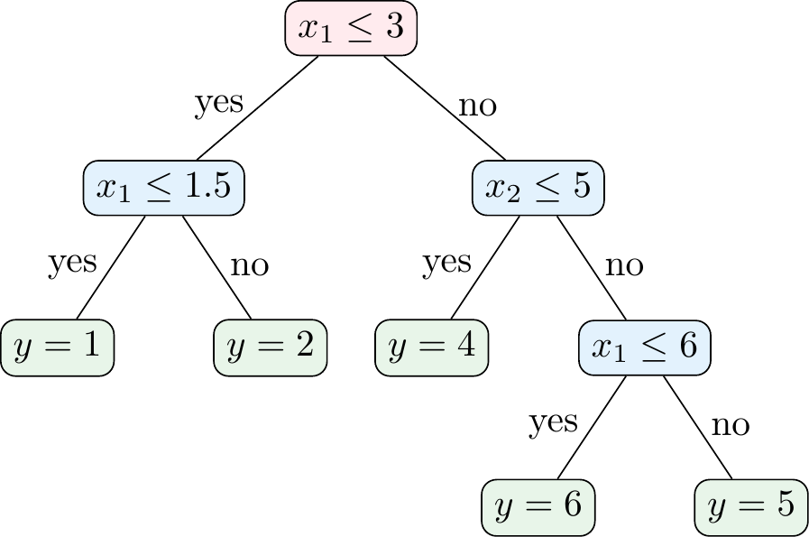 where \(R_m\) are the regions of the feature space, \(c_m\) are the predicted (i.e., average) values in the regions, \(\mathbb{1}(x \in R_m)\) is an indicator function that is 1 if \(x\) is in region \(R_m\) and 0 otherwise, and \(M\) is the number of regions.