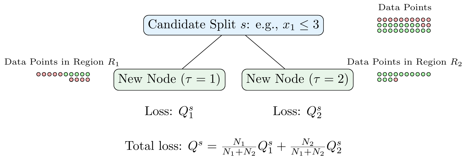 Let \(\tau\) denote the index of a leaf node with each leaf node \(\tau\) corresponding to a region \(R_{\tau}\) with \(N_{\tau}\) data points. In the case of a classification problem, the loss function is typically either the Gini impurity