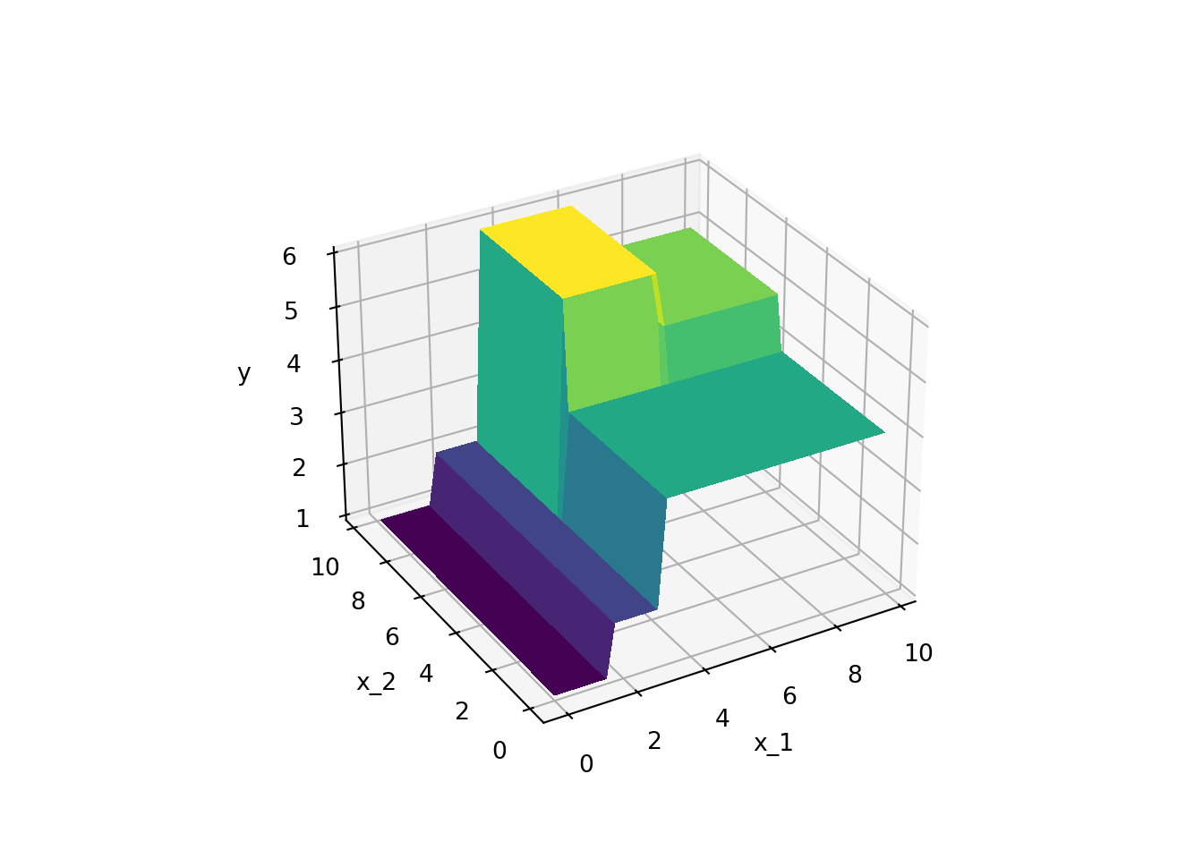 Figure 4.2 shows an example of a decision tree for a regression problem, i.e., a regression tree. In this case, the decision tree is used to predict some continuous variable \(y\) (e.g., a house price) based on features \(x_1\) and \(x_2\) (e.g., number of rooms and size of the property). As Figure 4.3 shows, the regression tree partitions the \((x_1,x_2)\)-space into different regions that are associated with a predicted value \(y\). Mathematically, the prediction of a regression tree can be expressed as